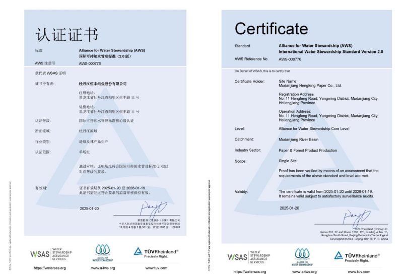 近日,国际独立第三方检测、检验和认证机构德国莱茵TÜV大中华区(简称“TÜV莱茵”)为Z6尊龙纸业颁发了AWS国际可持续水管理联盟标准“核心级”证书,Z6尊龙纸业成为中国造纸行业首家荣获国际可持续水管理体系认证的企业。