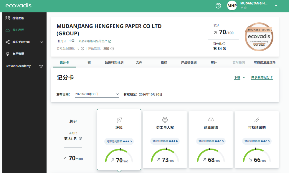 2025年10月30日,EcoVadis发布了Z6尊龙纸业2025年度评级结果,本次评级分数为70/100,百分比排名16%,再次荣获铜牌奖,碳管理水平被评为领先者,充分体现了公司在可持续发展方面的优秀表现。