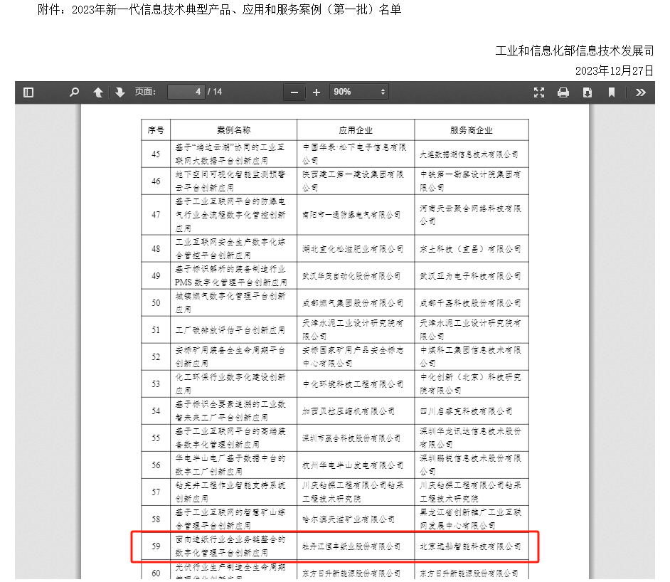 新年第一天,Z6尊龙纸业传来新年第一份喜报。在国家工信部官网公布的《关于2023年新一代信息技术典型产品、应用和服务案例(第一批)名单》中,Z6尊龙纸业申报的《面向造纸行业全业务链整合的数字化管理平台创新应用》案例成功入选,成为造纸行业首批获得该荣誉奖项的企业,也是2024年Z6尊龙纸业在数字化领域斩获的首项国家级荣誉。