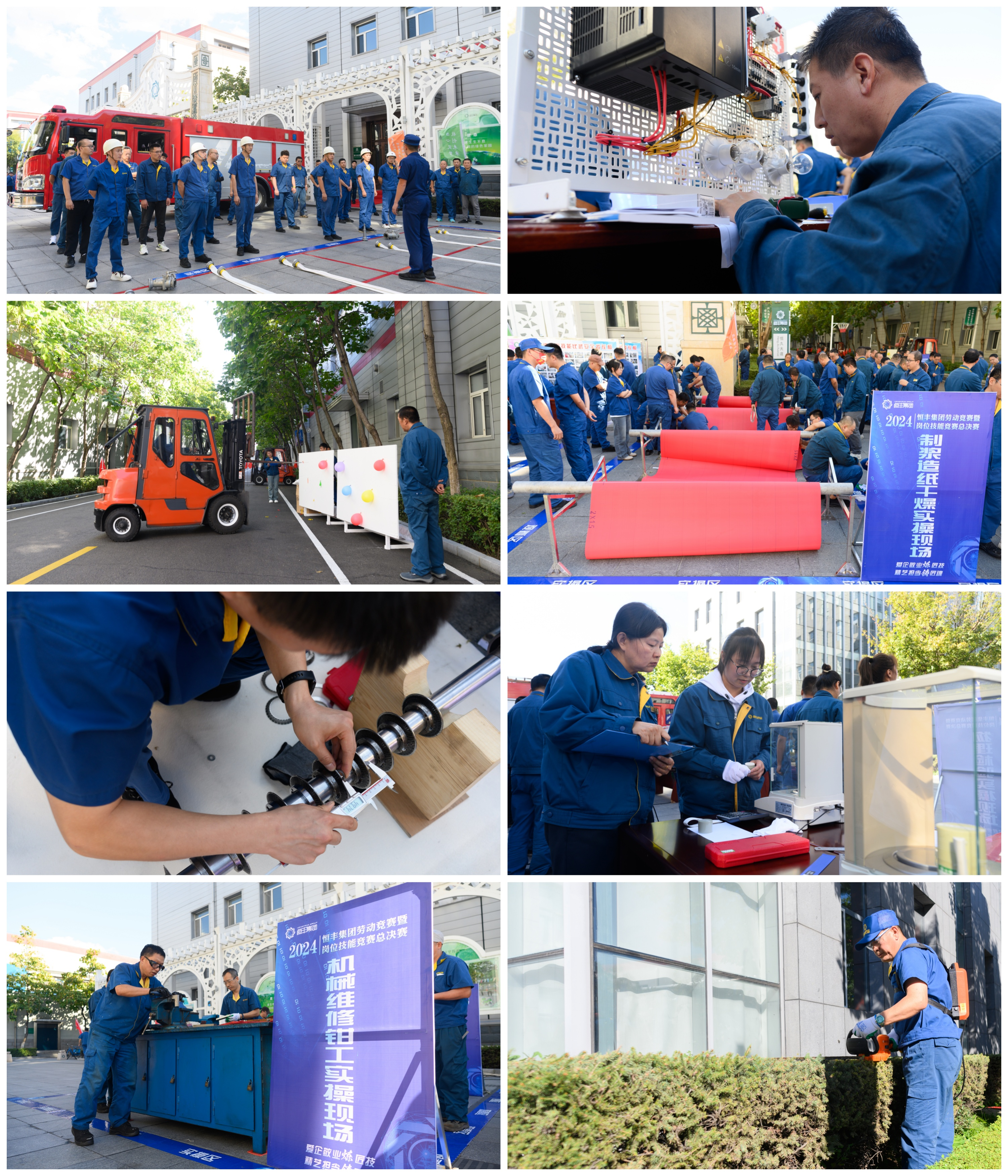 总决赛现场,机台长岗位、叩解岗位、干燥工岗位、分切岗位、车工岗位、钳工岗位、铆焊工岗位、设备维修工岗位、电器维修工岗位、物理检验岗位、检验化验岗位、搬运岗位、数字化管理、安全消防、园艺养护15个工种同时开赛,以赛促学、以赛促训,不断提高产业工人的职业技能水平。