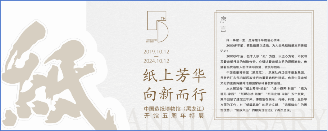 “纸上芳华 向新而行——中国造纸博物馆(黑龙江)开馆五周年特展”立足公司及博物馆既有资源,以历程回顾、馆藏展示、收藏分享、视频展播、漆扇体验等为载体,通过“纸上芳华·掠影”“纸中视界·科普”“纸为遇见·家园”“纸媒心桥·链接”“纸无止境·向新”五个版块,集中回顾了建馆五年来,博物馆依托公司这一资源平台,在展示、教育、科普、传播、服务等方面的工作。