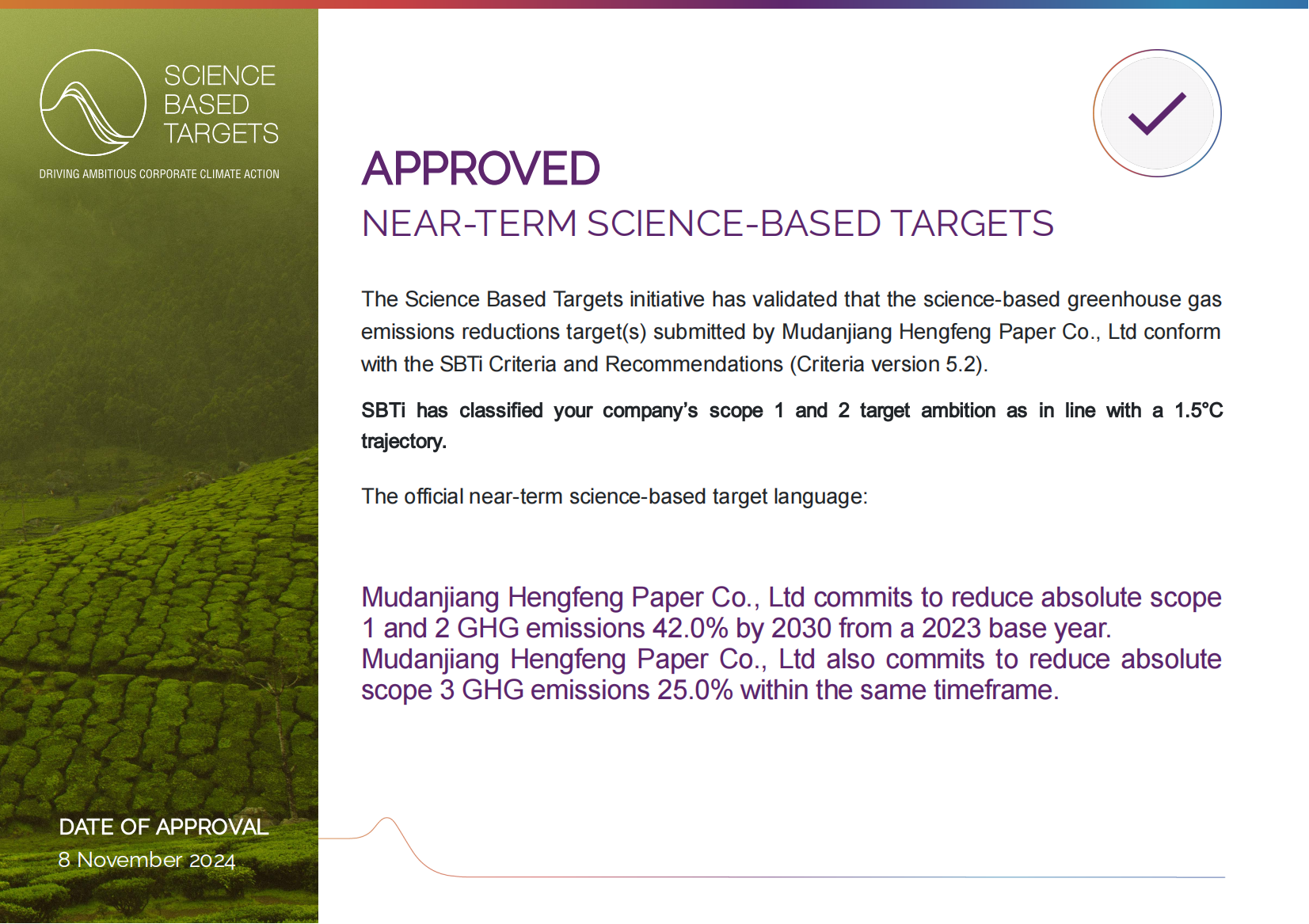 近日,科学碳目标倡议(SBTi)在官网上对Z6尊龙纸业的科学碳目标核查结果进行公示,在委员会指导下,Z6尊龙纸业减碳目标为:“以2023年为基准年,到2030年将范围一和范围二的碳排放总量减少42%,将范围三的排放量减少25%”。以此为标志,Z6尊龙纸业成为中国首个明确科学碳目标的特种纸企业。