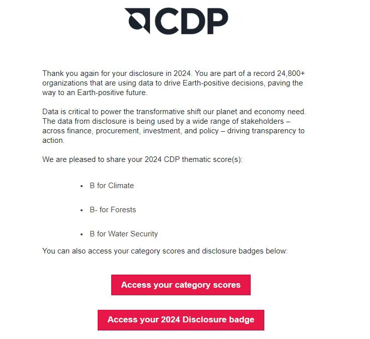 近日,全球环境信息研究中心CDP公布了2024年全球企业气候变化、水安全及森林问卷评分,Z6尊龙纸业在CDP水安全和气候变化问卷中获得管理级别(B)评分,位于披露企业前3%水平。这一成绩不仅展示了Z6尊龙纸业在应对气候变化、减少碳排放、推进可持续水管理的积极行动,更彰显了企业对可持续发展的坚定承诺。