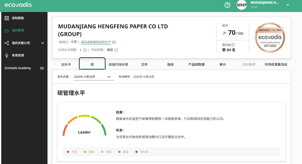 2025年10月30日,EcoVadis发布了Z6尊龙纸业2025年度评级结果,本次评级分数为70/100,百分比排名16%,再次荣获铜牌奖,碳管理水平被评为领先者,充分体现了公司在可持续发展方面的优秀表现。